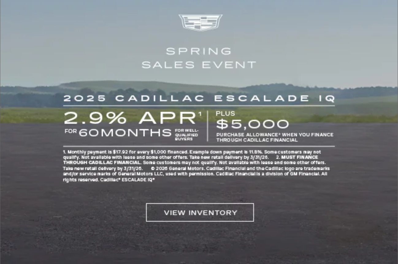1. Monthly payment is $17.92 for every $1,000 financed. Example down payment is 11.8%. Some customers may not qualify. Not available with lease and some other offers. Take new retail delivery by 3/31/26. 2. MUST FINANCE THROUGH CADILLAC FINANCIAL. Some customers may not qualify. Not available with lease and some other offers. Take new retail delivery by 3/31/26. © 2026 General Motors. Cadillac Financial and the Cadillac logo are trademarks and/or service marks of General Motors LLC, used with permission. Cadillac Financial is a division of GM Financial. All rights reserved. Cadillac® ESCALADE IQ®