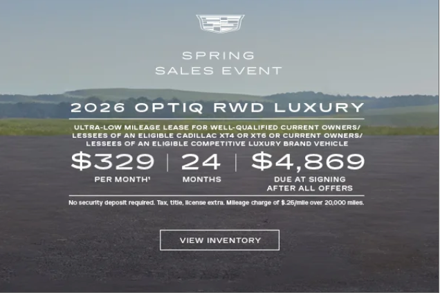 1. Must be a current owner of a 2019 model year or newer or a current lessee of a 2021 model year or newer Cadillac XT4 or XT6 vehicle through GM Financial or Cadillac Financial or a current owner of a 2012 model year or newer or a current lessee of a 2021 model year or newer Acura, Audi, BMW, Ford, Honda, Hyundai, Infiniti, Jeep, Kia, Lexus, Lincoln, Mercedes-Benz, Toyota, Volvo, Porsche, Tesla, Genesis, Polestar, or Rivian for at least 30 days prior to the new vehicle sale. Payments are for a 2026 OPTIQ RWD Luxury with an MSRP of $53,420. 24 monthly payments total $7,896. Total Lease Cost is $12,421.91. Lease based on net capitalized cost of $44,609.76 including down payment of $4,540 and $2,000 in applied incentives. Closed-end lease. Option to purchase at lease end for an amount to be determined at lease signing. Cadillac Financial/GM Financial must approve lease. Take new retail delivery by 4/30/26. Mileage charge of $.25/mile over 20,000 miles. Late payment and early termination fees apply. Lessee is responsible for insuring the lease vehicle. Lessee pays for maintenance, repair, excess wear and disposition fee of $595 or less at end of lease. Not available with some other offers. At participating dealers. © 2026 General Motors. Cadillac Financial and the Cadillac logo are trademarks and/or service marks of General Motors LLC, used with permission. Cadillac Financial is a division of GM Financial. All Rights Reserved. Cadillac® OPTIQ®