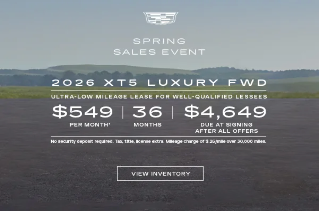 1. Payments are for a 2026 XT5 Luxury FWD with an MSRP of $46,595. 36 monthly payments total $19,764. Total Lease Cost is $23,835.57. Lease based on net capitalized cost of $41,256.90 including down payment of $4,100 and $2,800 in applied incentives. Closed-end lease. Option to purchase at lease end for an amount to be determined at lease signing. Cadillac Financial/GM Financial must approve lease. Take new retail delivery by 3/31/26. Mileage charge of $.25/mile over 30,000 miles. Late payment and early termination fees apply. Lessee is responsible for insuring the lease vehicle. Lessee pays for maintenance, repair, excess wear and disposition fee of $595 or less at end of lease. Not available with some other offers. Residency restrictions apply. © 2026 General Motors. Cadillac Financial and the Cadillac logo are trademarks and/or service marks of General Motors LLC, used with permission. Cadillac Financial is a division of GM Financial. All Rights Reserved. Cadillac® XT5®